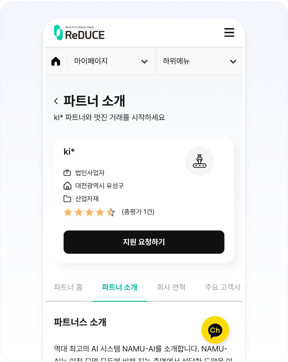 클라이언트가 필요한 제품을 리듀스를 통해 입찰 등록하면 해당 조건에 적합한 여러 입찰 견적을 파트너스가 제안합니다.