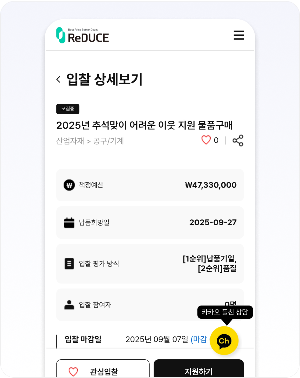제안 금액, 납기일, 제품 사양 등 다양한 조건의 제안을 한눈에 비교하며 원하는 입찰을 직접 선정하고 리듀스를 통해 안전한 전자계약과 결제, 납품부터 검수까지 진행됩니다.